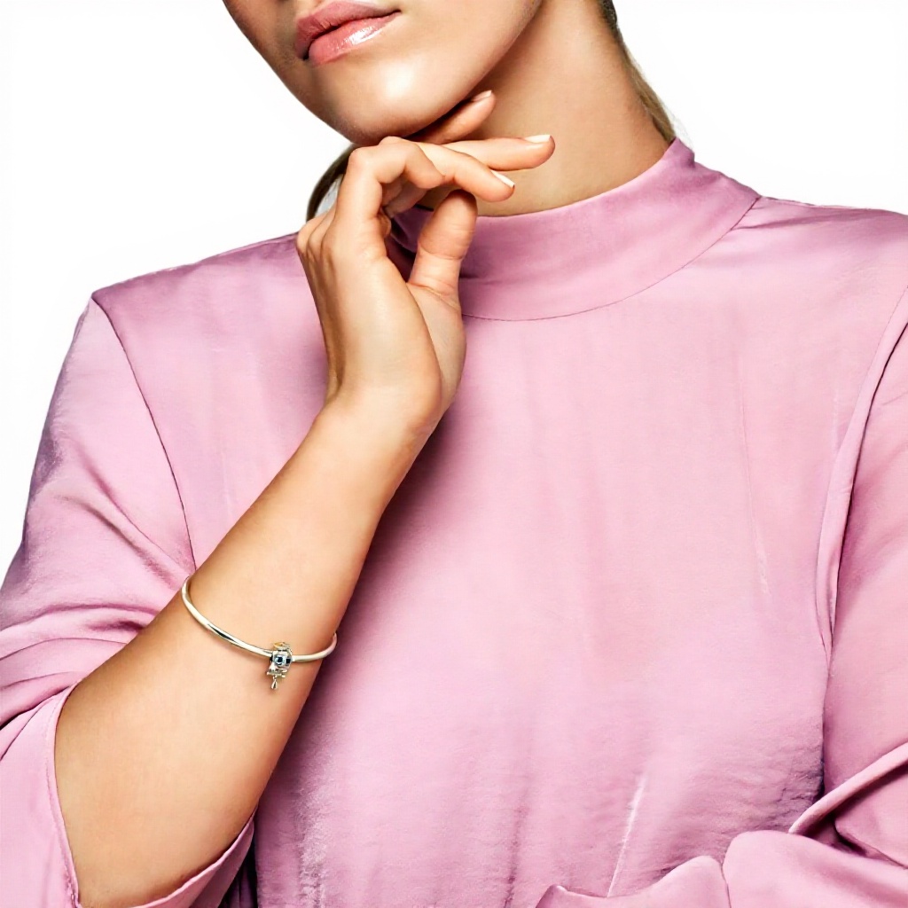 Il charm è realizzato in Argento Sterling 925, con inserti in cristalli blu. Le dimensioni sono ottimal per un’applicazione discreta ma significativa sui bracciali, e il peso leggero assicura comfort durante l’uso quotidiano. Modello unico senza opzioni di colore aggiuntive.