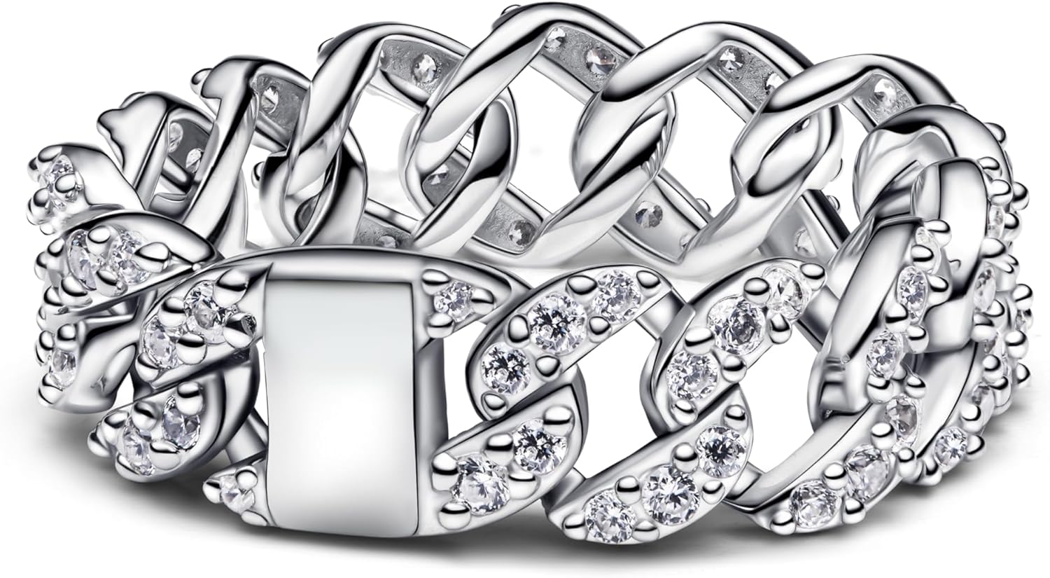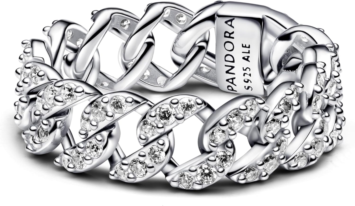 Questo anello Pandora in argento sterling presenta un raffinato design a catena con 84 zirconi cubici trasparenti dal taglio rotondo, disposti in un effetto pavé che crea una lucentezza intensa. La lavorazione semicircolare e il retro lucido assicurano comfort e eleganza, mentre il logo piatto aggiunge un dettaglio distintivo.