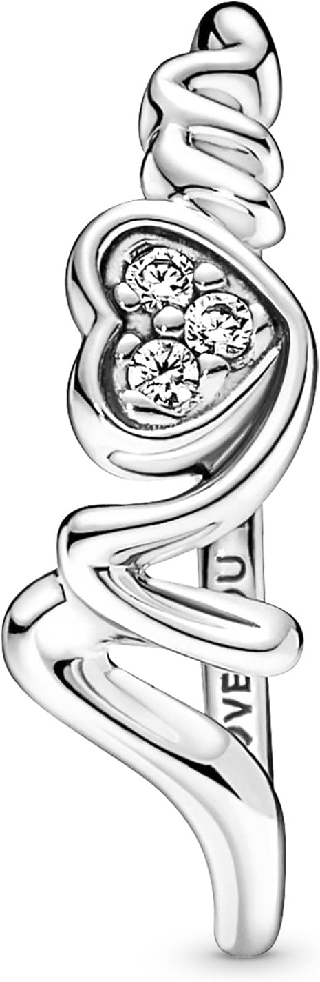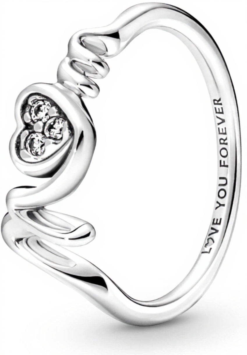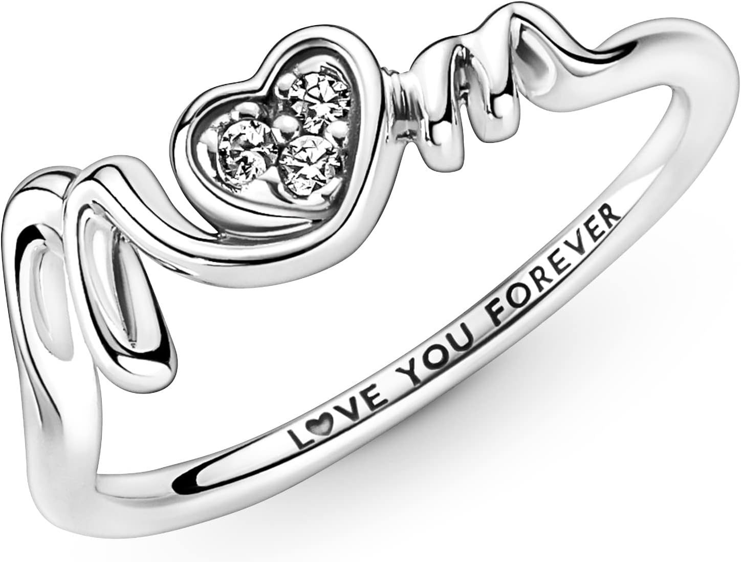L’anello PANDORA Mom è realizzato in argento sterling di alta qualità, con un design a cuore che sfocia nella scritta “Mum”. Tre pietre di zirconia cubica incolori con taglio a brillante abbelliscono il cuore, aggiungendo luminosità e eleganza. L’interno della fascia presenta l’incisione “Love You Forever”, un tributo all’amore materno.