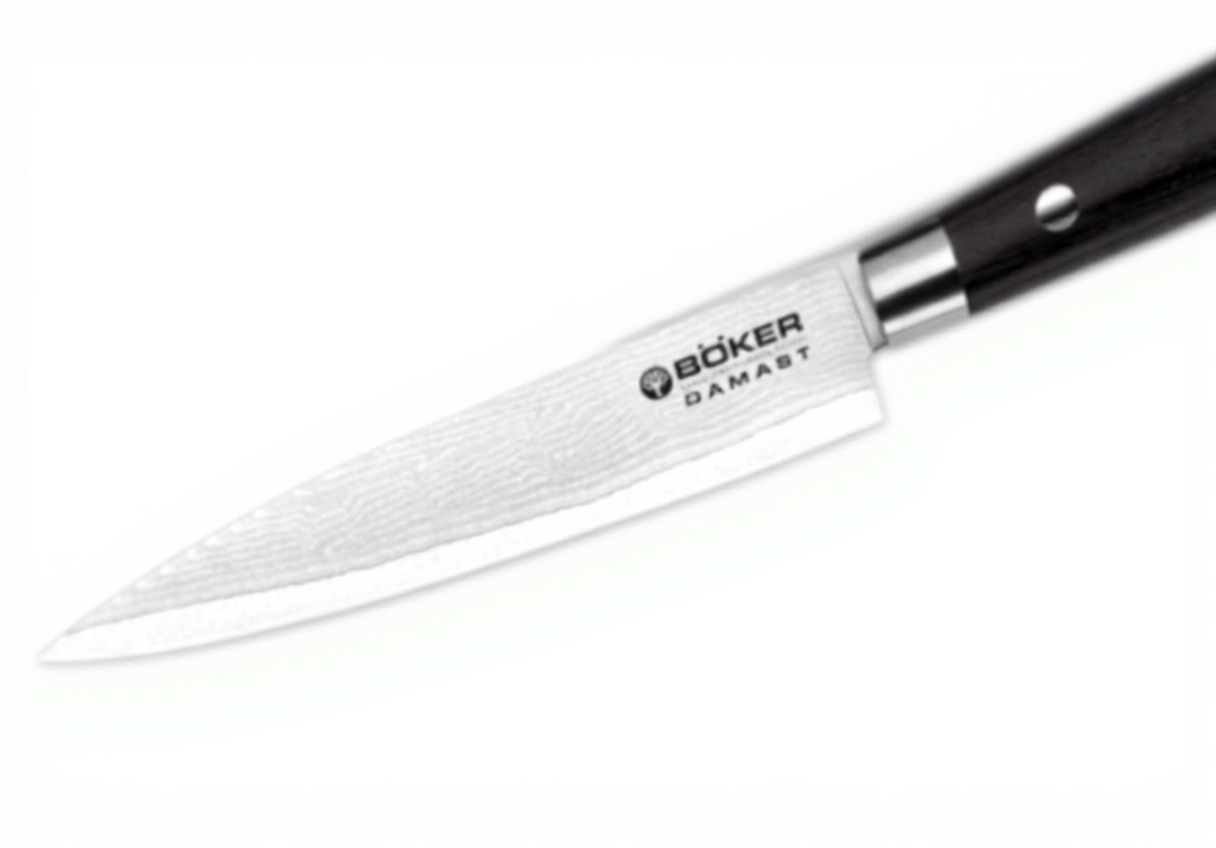 Questo coltello da chef Böker si distingue per la lama in Damast, un materiale noto per la sua resistenza e affilatura duratura, combinata con un design nero elegante. Il manico in compensato offre una presa sicura e confortevole, rendendolo adatto per sessioni prolungate in cucina. La costruzione leggera e bilanciata assicura precisione in ogni taglio.