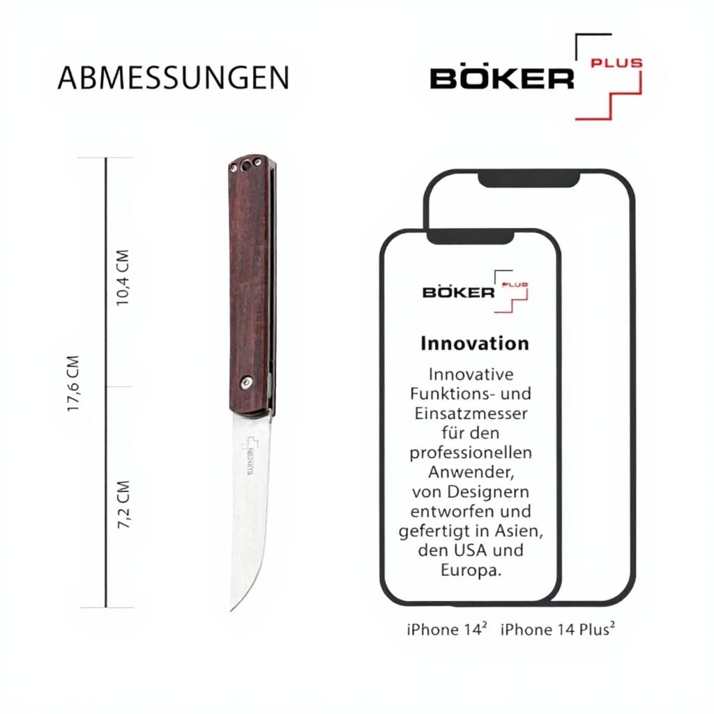 Il BÖKER PLUS Wasabi combina un design lineare e una lama giapponese classica per un coltello elegante e funzionale. La lama in acciaio 440C si apre tramite un flipper frontale ed è mantenuta in posizione da un sistema Detent Ball. Il manico presenta piastre in acciaio inox con clip fresata e un rivestimento in legno di cocobolo selezionato, offrendo una presa sicura e un aspetto raffinato.