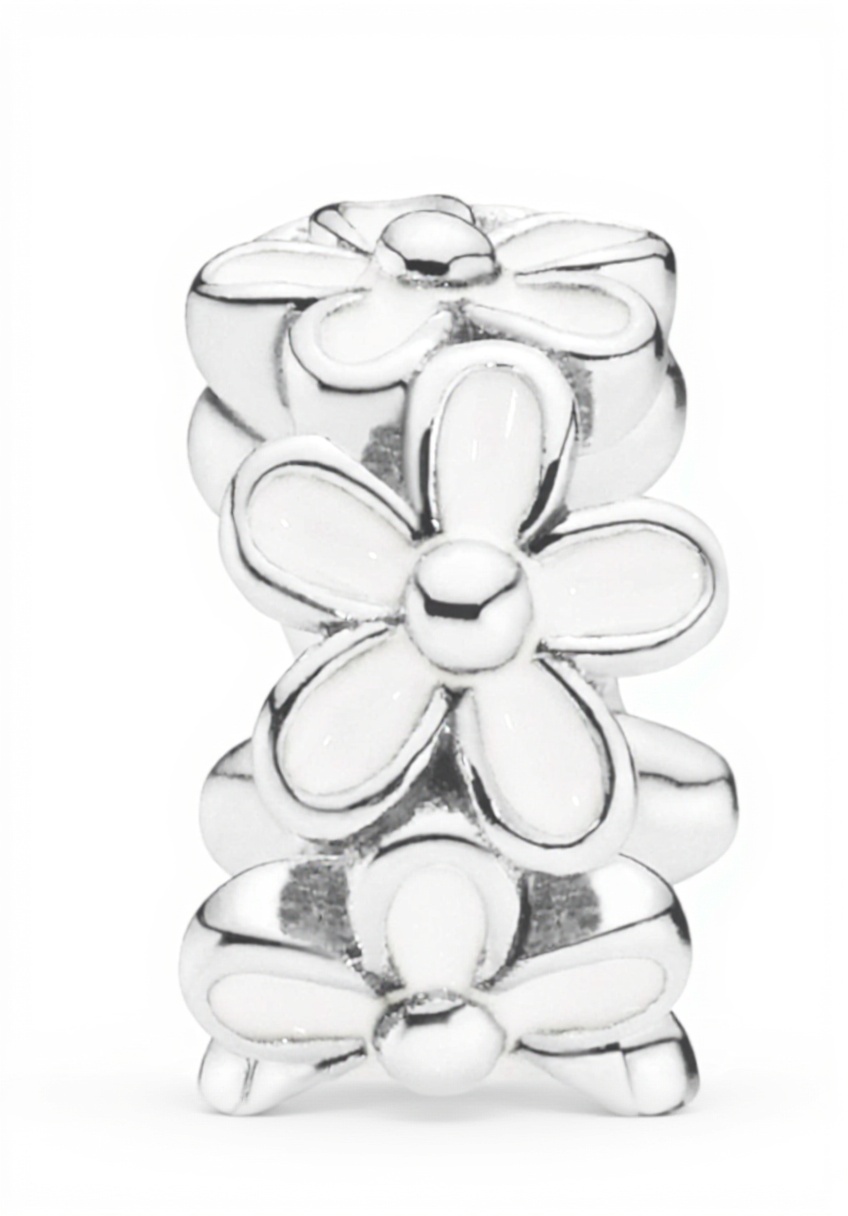 Il charm è progettato come elemento intermedio per bracciali Pandora, con dimensioni compatte che si adattano agevolmente ad altri charm. Realizzato in argento 925, è leggero e resistente, con smalto bianco applicato sui petali per un effetto vivace. Non include una scatola, che è disponibile separatamente, e si integra facilmente con la maggior parte dei bracciali Pandora per una personalizzazione senza sforzo.