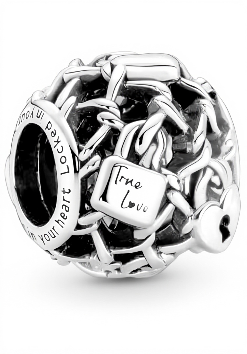 Questo charm PANDORA è realizzato in argento sterling di alta qualità, con un design elegante che include un lucchetto e un pendente openwork. Presenta incisioni dettagliate con messaggi romantici come ‘Locked in your heart’, ‘True love’ e ‘Love you’, rendendolo un pezzo unico per esprimere emozioni.