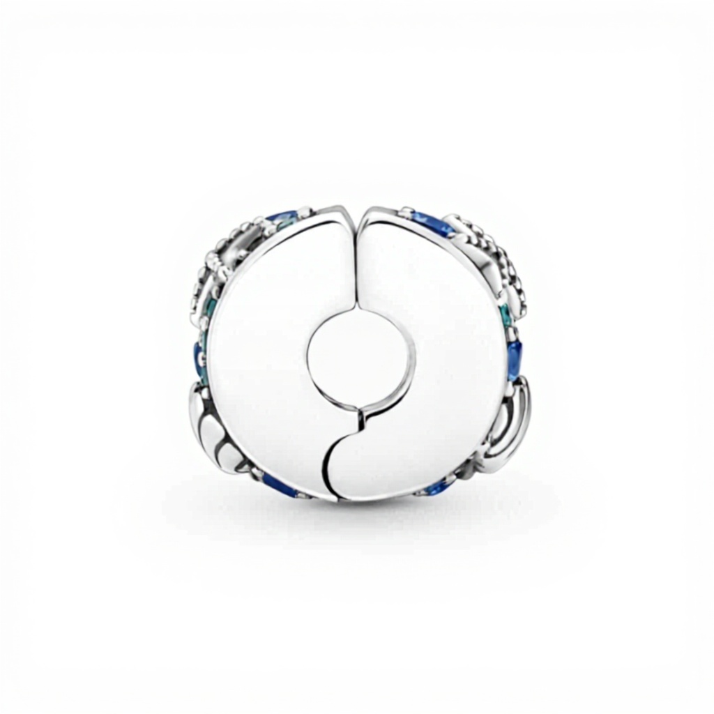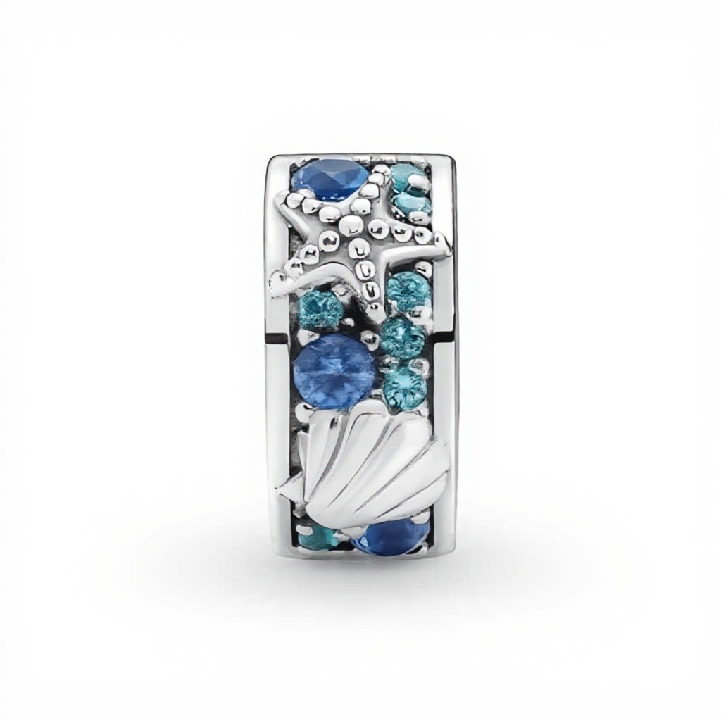 Questa clip Pandora in argento Sterling 925 è abbellita da una delicata stella marina e una conchiglia, arricchite con cristalli verde ghiaccio, blu acqua sbiancato e blu stellare. L’inserto in silicone assicura una posizione stabile sul bracciale, evitando spostamenti indesiderati, e non può essere inserita sulle due filettature, garantendo un montaggio sicuro e personalizzabile.