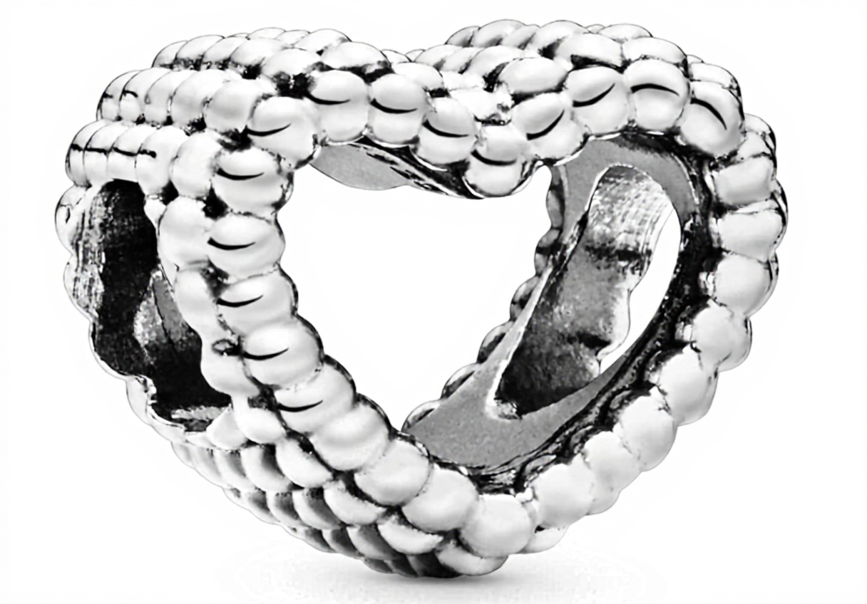 Il charm Pandora Purely presenta un design a cuore aperto abbellito con sfere, realizzato in argento per una finitura luminosa e duratura. Questo ciondolo si distingue per la sua struttura tridimensionale che cattura la luce, aggiungendo profondità e un tocco romantico al bracciale.