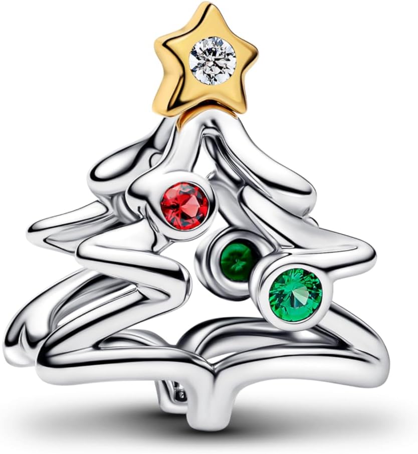 Questo ciondolo PANDORA riprende il classico albero di Natale con un design aperto e raffinato, realizzato in argento sterling placcato oro 14 carati. È impreziosito da zirconi artificiali rossi e verdi che creano un effetto brillante, culminando in una punta a stella per un tocco festivo unico. La compatibilità esclusiva con la collezione Moments lo rende un accessorio versatile per personalizzare bracciali Pandora.
