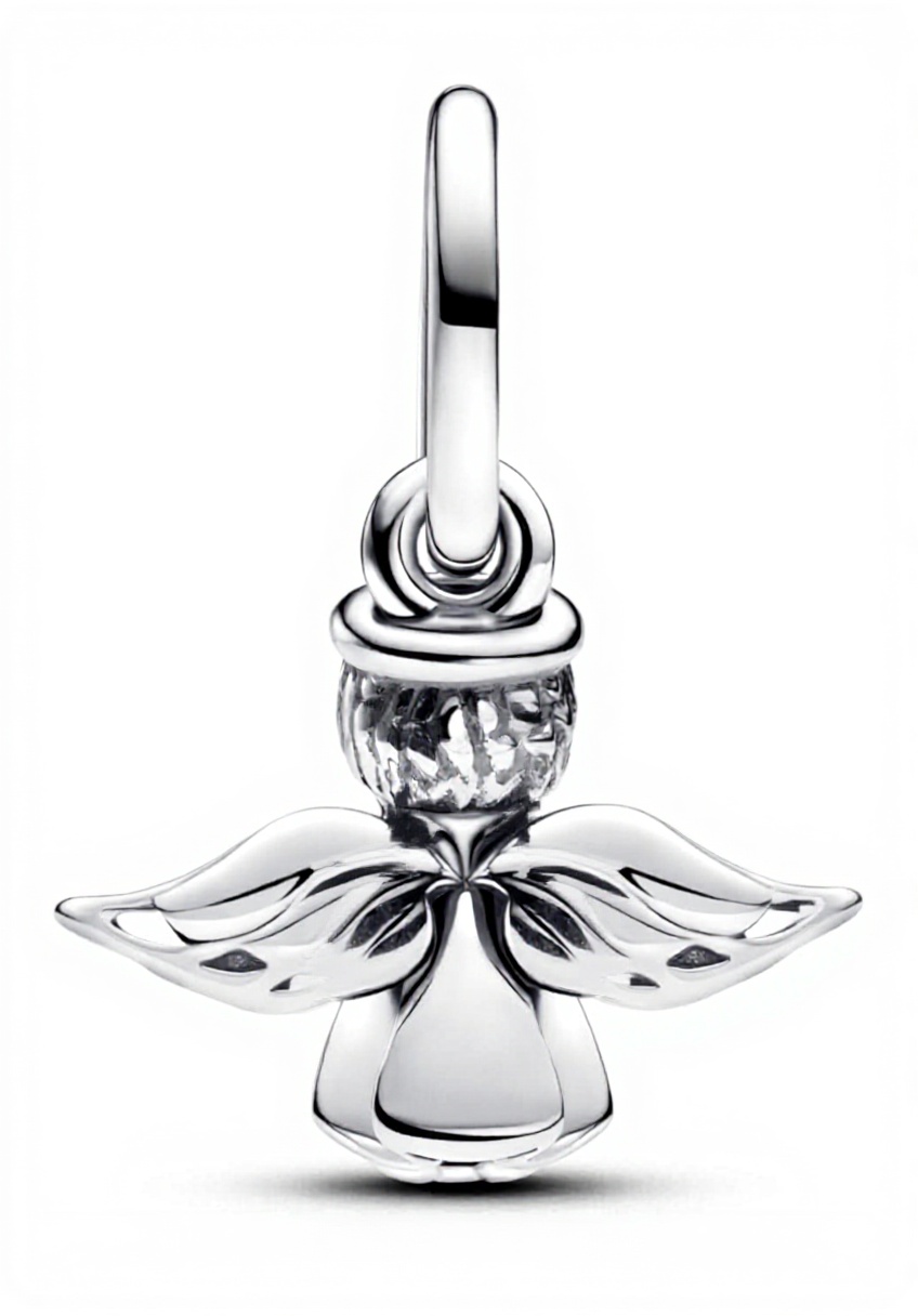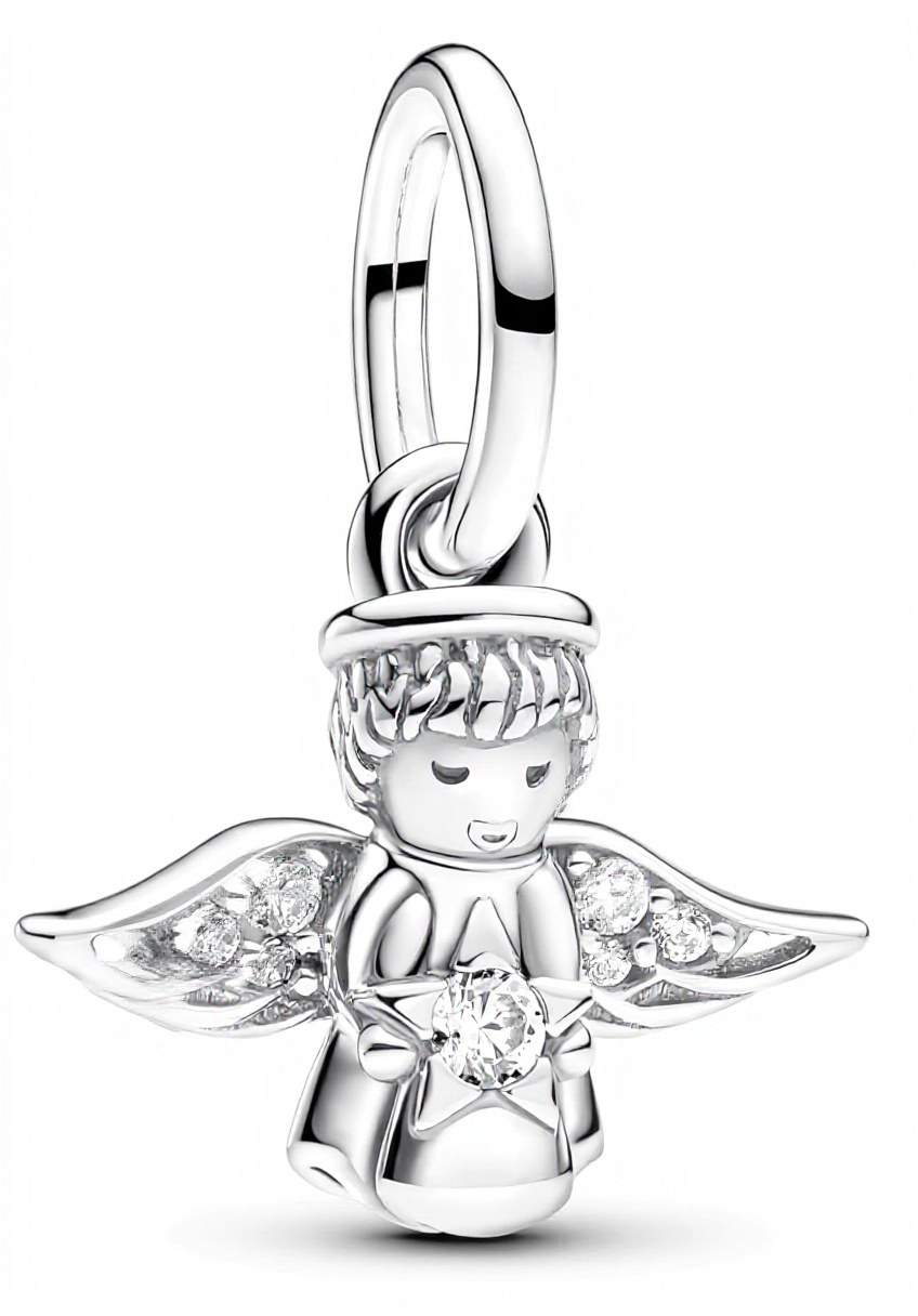 Il ciondolo angelo PANDORA è realizzato in argento sterling 925, con ali elegantemente tempestate di zirconia cubica che catturano la luce. L’angelo regge una stella luminosa, simbolo di gioia e speranza, rendendolo un pezzo unico per esprimere emozioni festive e personali. La finitura lucida e i dettagli precisi riflettono l’alta qualità artigianale di PANDORA, garantendo durabilità e brillantezza nel tempo.