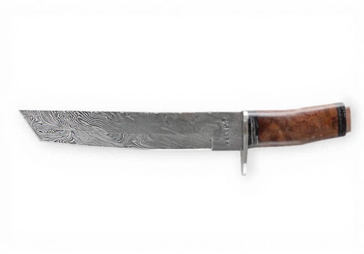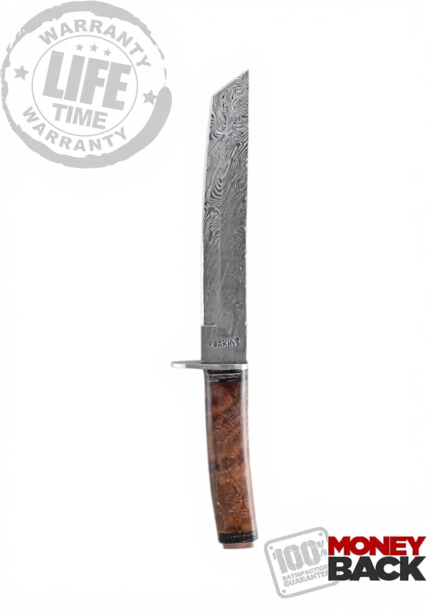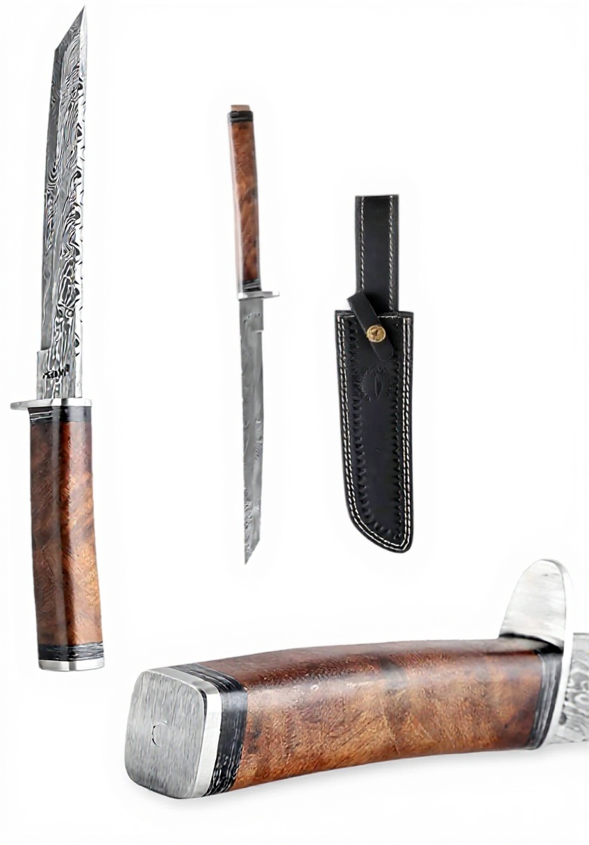 Questi coltelli da caccia Perkin sono realizzati artigianalmente in acciaio damasco, noto per la sua resistenza e affilatura superiore. La lama doppia garantisce versatilità d’uso, mentre l’impugnatura in legno di noce offre una presa sicura e confortevole. Il fodero in cuoio completa l’equipaggiamento, proteggendo la lama e facilitando il trasporto.