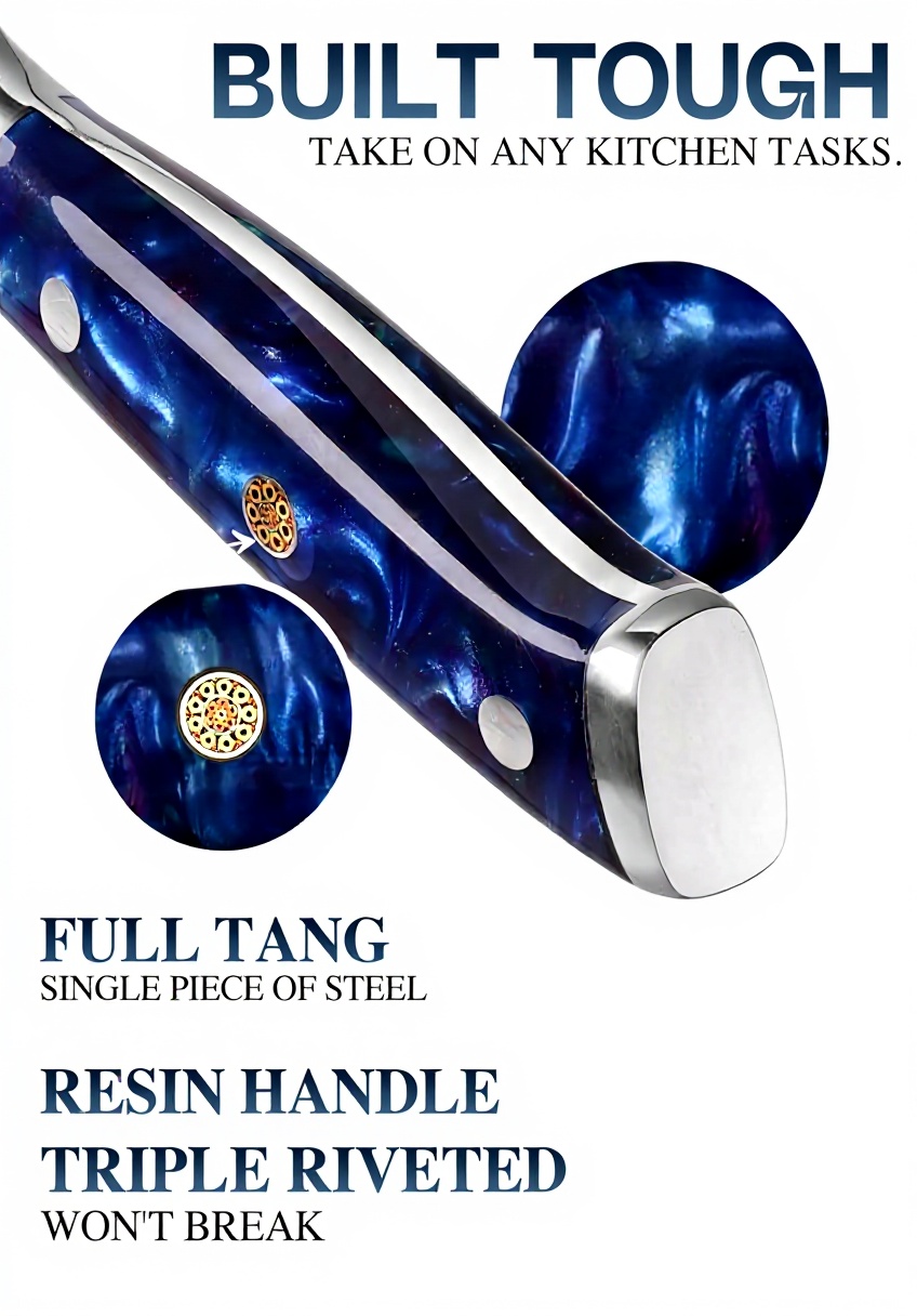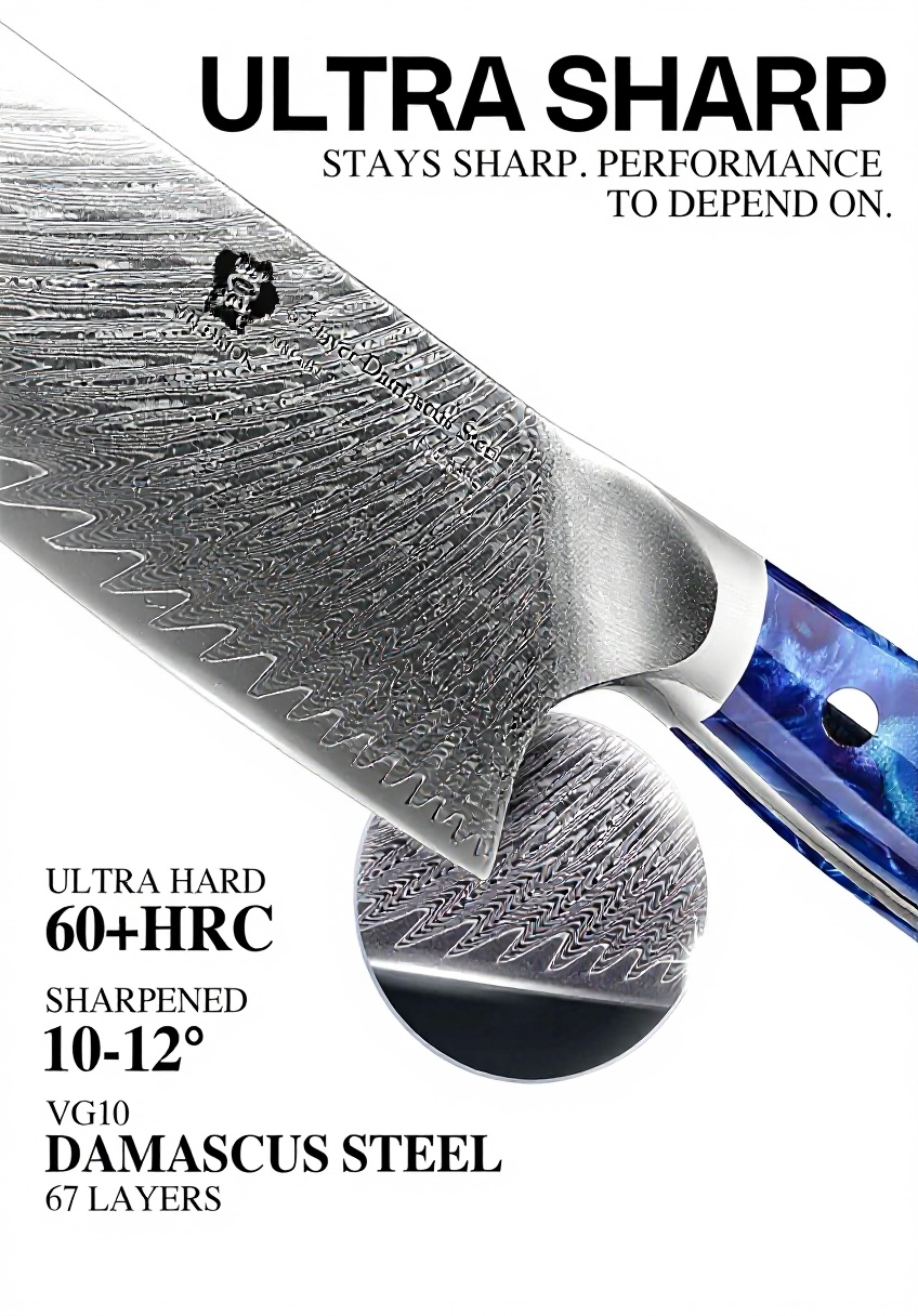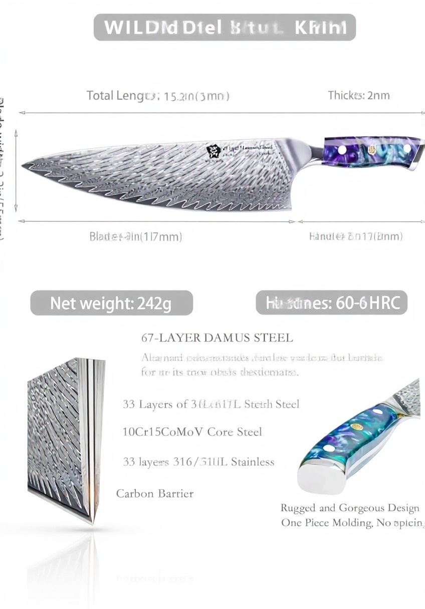 Il coltello da chef WILDMOK è realizzato con acciaio damasco giapponese a 67 strati, sottoposto a trattamento termico sottovuoto e raffreddamento ad azoto liquido per garantire durabilità e prestazioni superiori. Il manico in resina full tang, fissato con rivetti tripli, assicura una presa sicura e stabile, distinguendosi per resistenza e design unico.