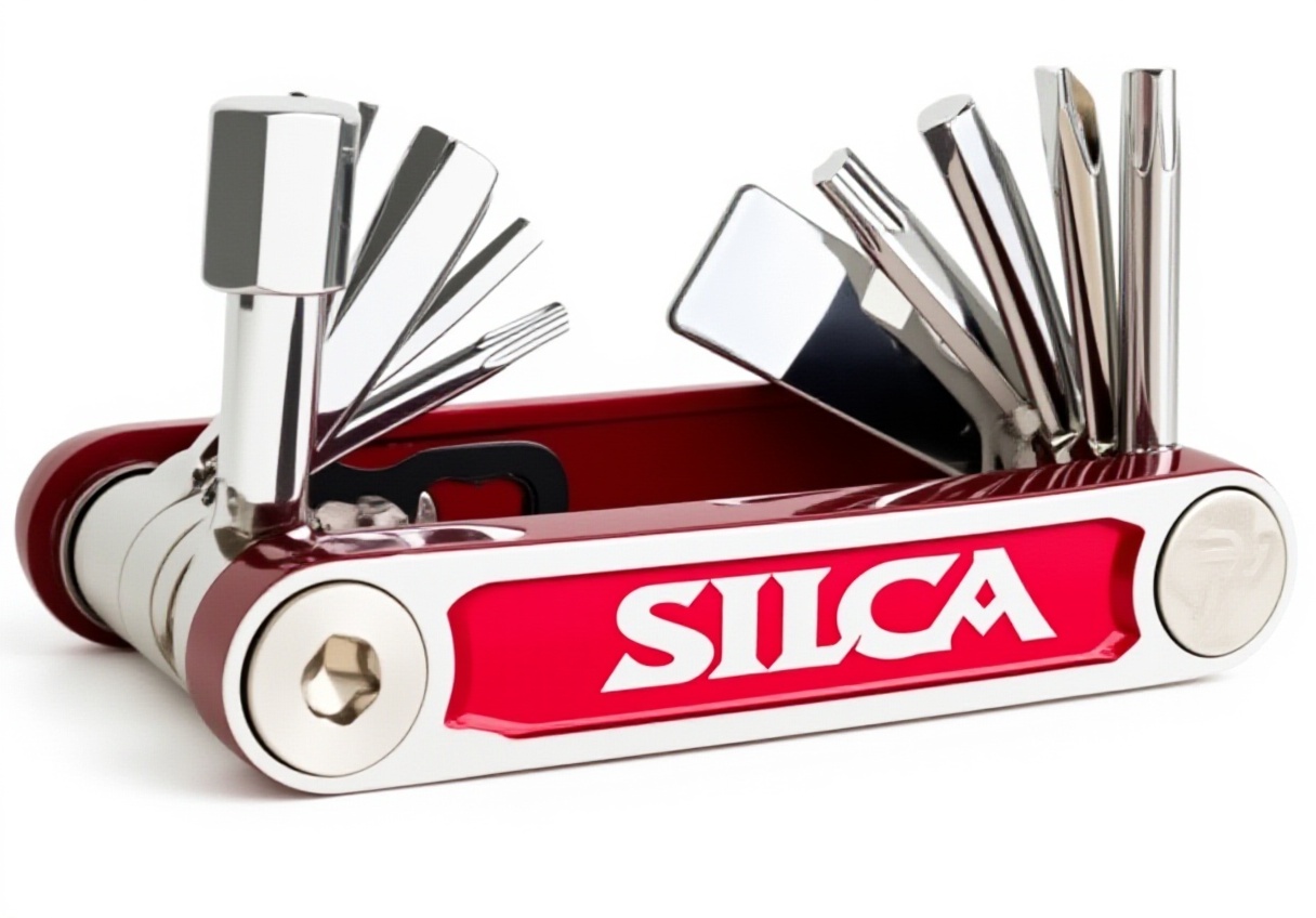 Il modello Tredici include 13 utensili: chiavi esagonali 2, 2.5, 3, 4, 5, 6, 8 mm, Torx 10, 20, 25, cacciavite a croce PH2, cacciavite piatto e uno spargidisco per pastiglie freno.