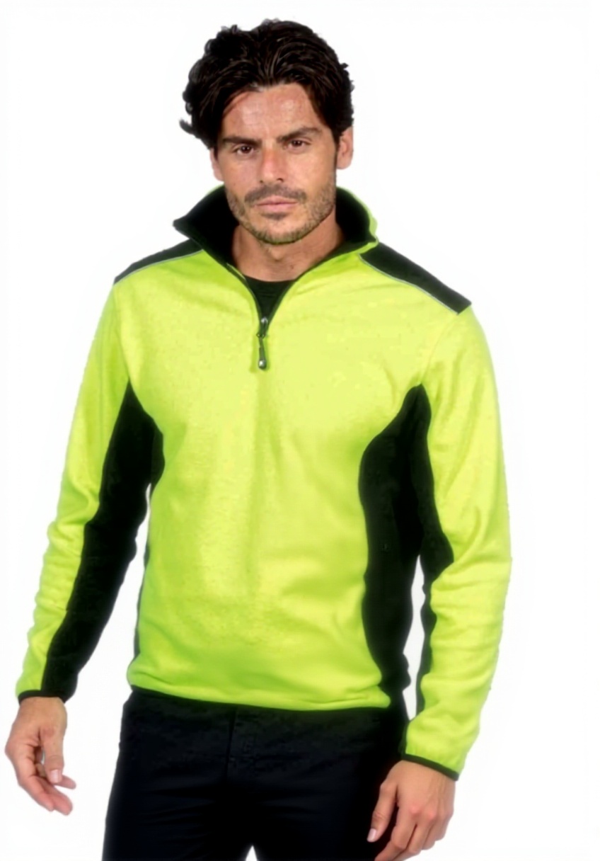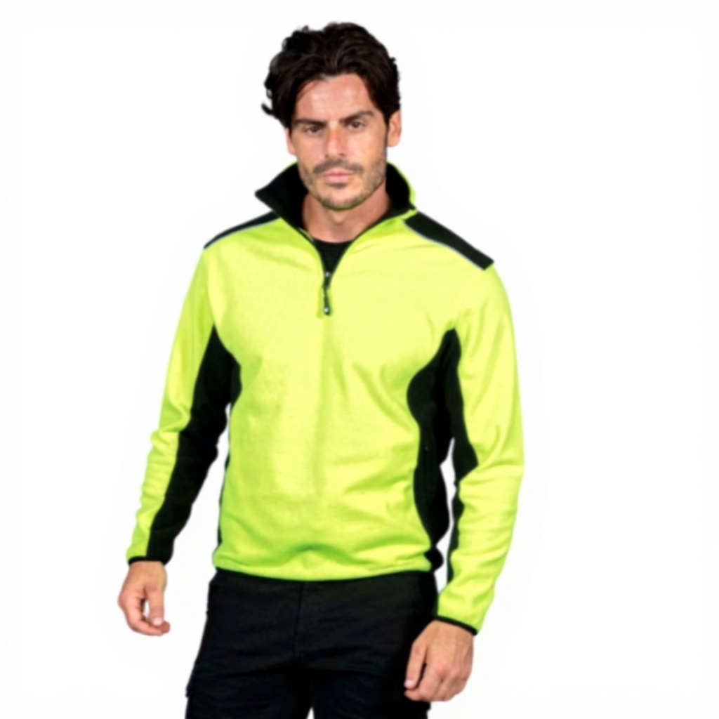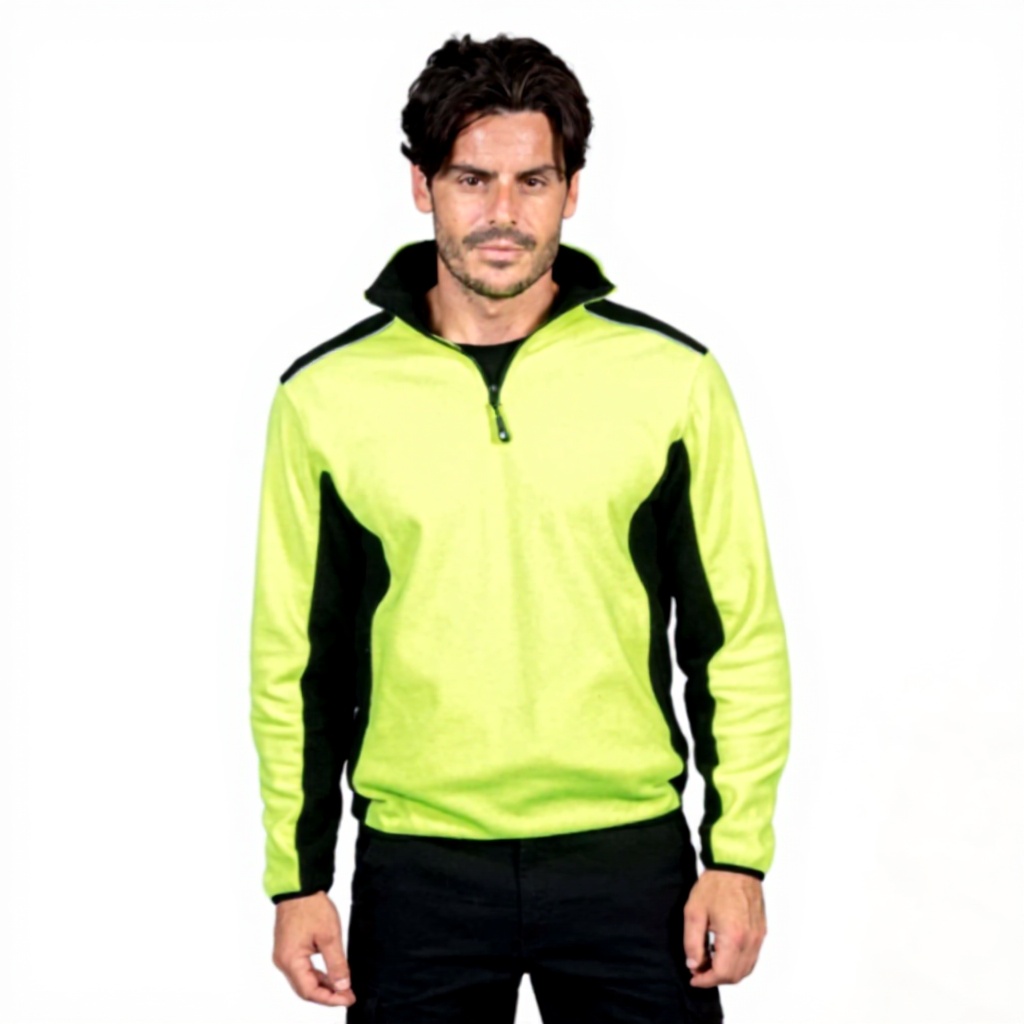 Questa felpa pile da lavoro è realizzata in poliestere riciclato antipilling, con peso di 280 grammi/mq. Include una mezza zip, piping rifrangente sulle spalle e schiena, tasca con zip sul petto e tessuto elastico ai polsi per massima comodità e funzionalità.