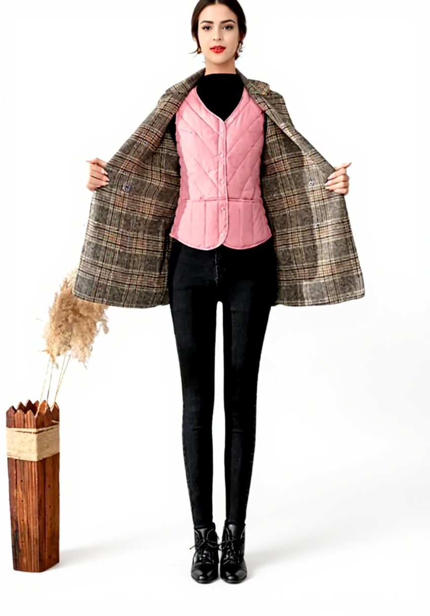 Questo gilet senza maniche unisce design vintage e funzionalità moderna. Presenta uno scollo a V elegante e bottoni frontali, realizzato in cotone e poliestere con imbottitura in piumino o cotone per garantire calore senza peso. La vestibilità è studiata per comfort ottimale e versatilità di stile.