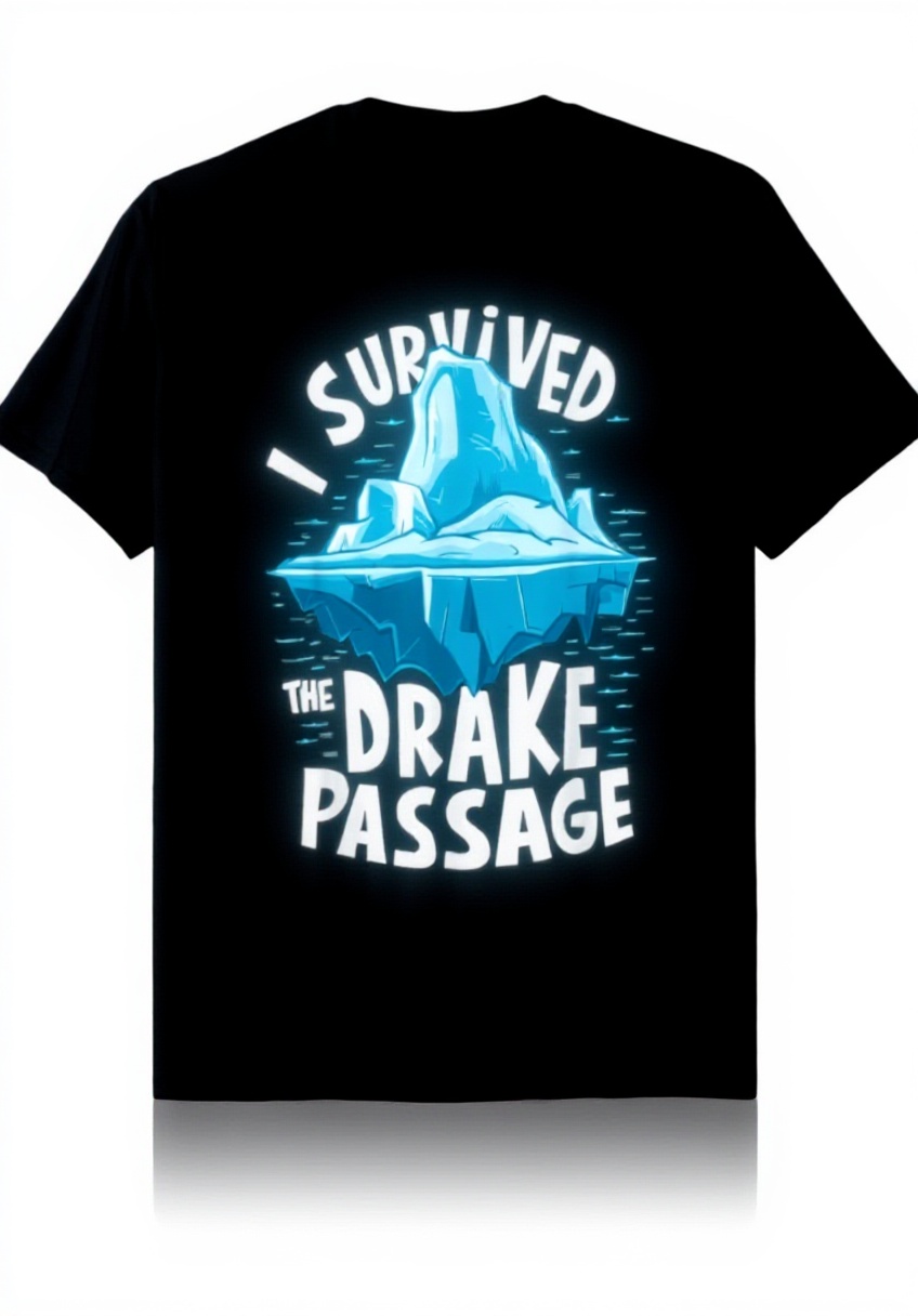 Attualmente, il design I Survived The Drake Passage è offerto in questo stile con grafica iceberg; per variazioni, controlla le opzioni del produttore Nautical Humor Designs su Amazon.