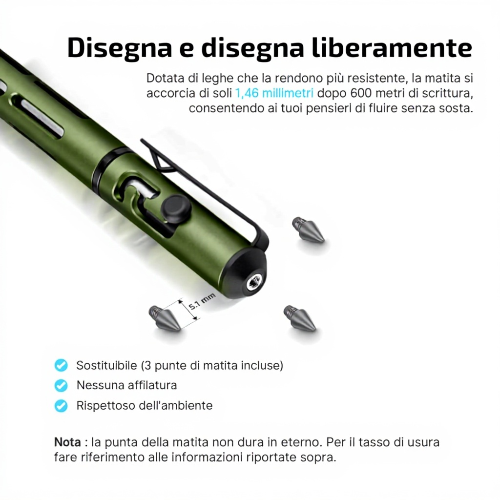 - Struttura a blocco: transizione sicura tra penna e matita con una mano, evitando attivazioni accidentali in borse o tasche.