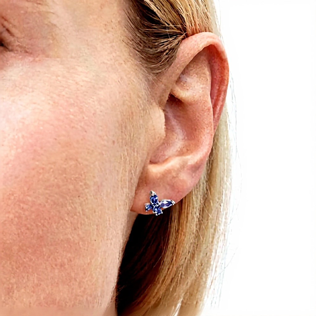 Questi orecchini a perno Pandora presentano un design a farfalla realizzato in argento sterling, arricchito da cristalli artificiali blu che ricordano un cielo stellato. Sono ideali per lo stacking, permettendo di combinare più gioielli per un look personalizzato e unico.