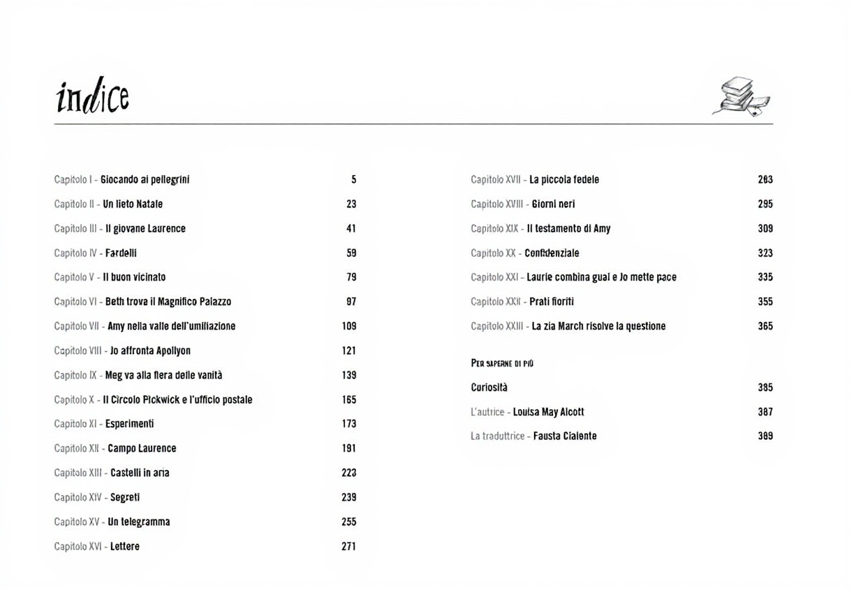 Piccole donne ha 416 pagine, offrendo una lettura approfondita senza essere eccessivamente lunga per i giovani lettori.