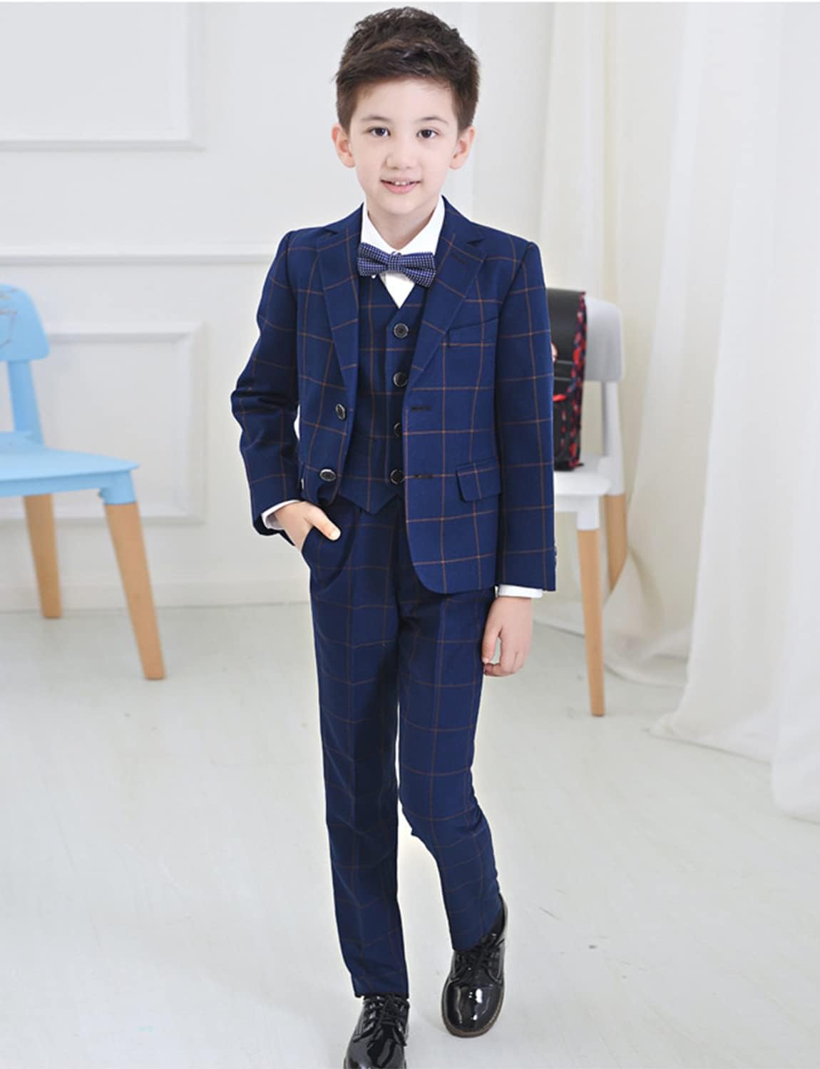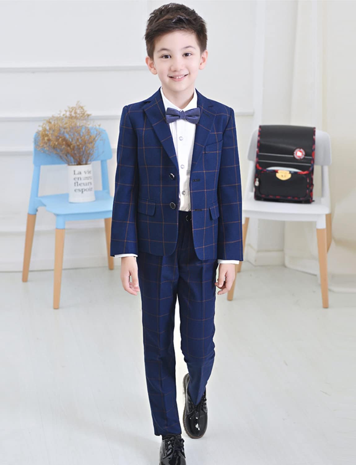 Ragazzi Tuta a Quadri Tre Pezzi con Risvolto a Tacche